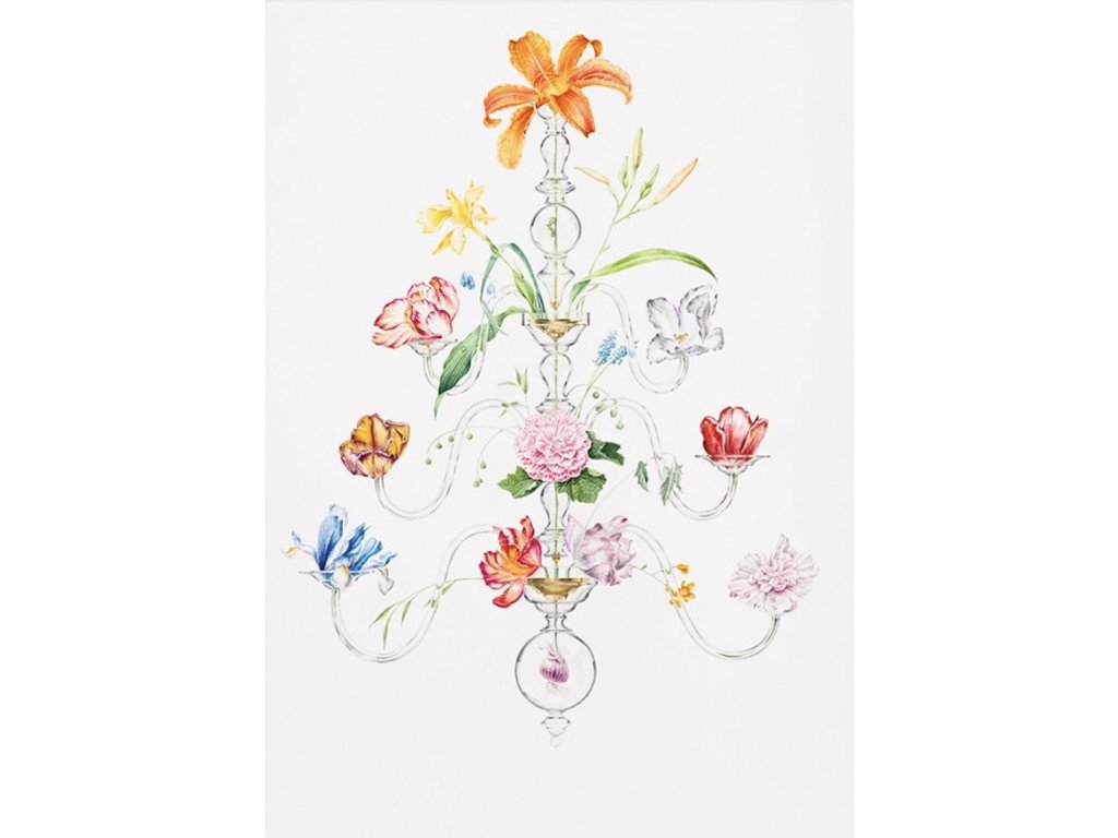 Krajka jarních cibulovin, denivky a kosatce vyšitá na střídmých formách renesančního Nizozemí.